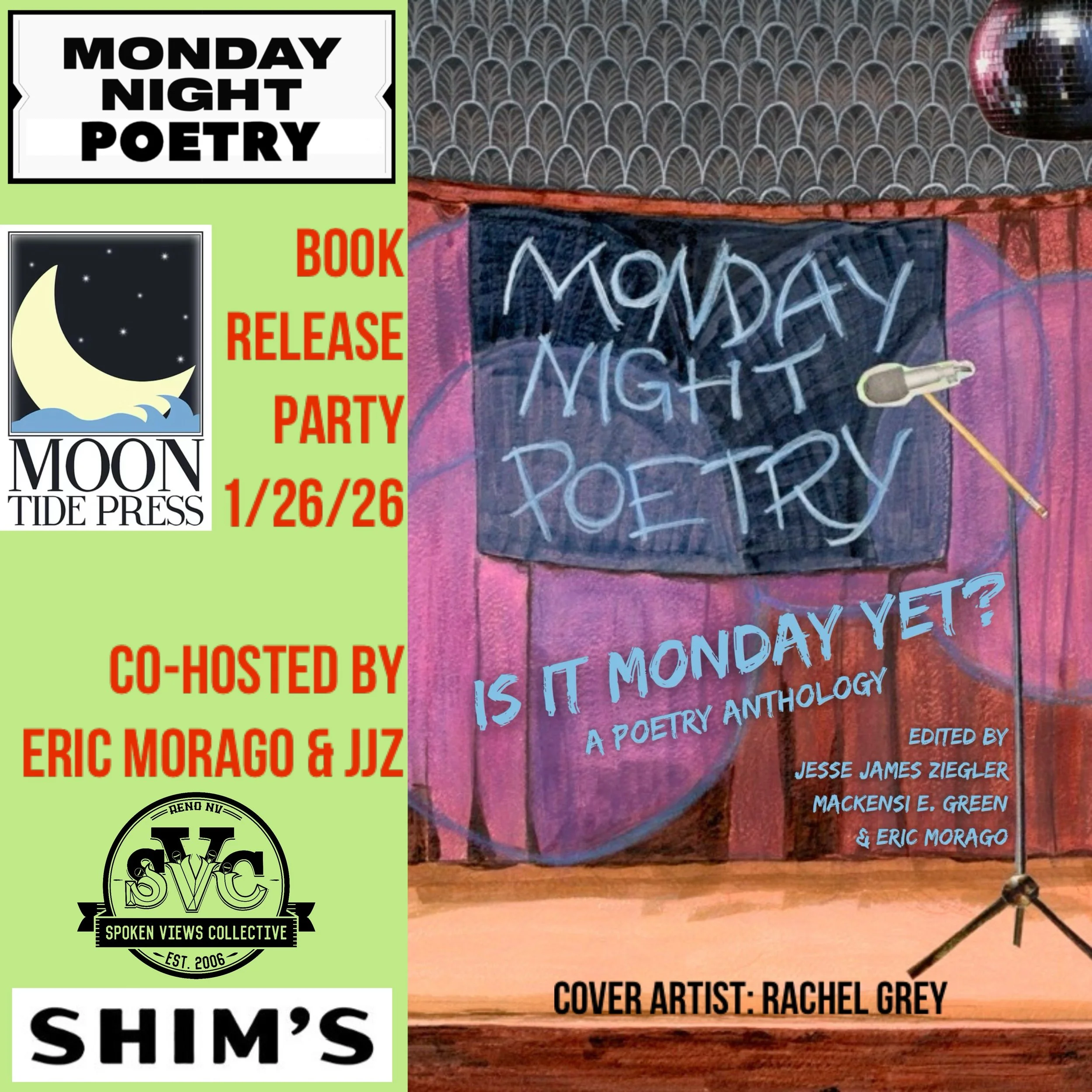 Our community was featured on PBS Reno as a segment in their Arteffects series and was able to haul in back-to-back best open mic wins through the Reno News and Review Best of annual competition in 2024 and 2025. We’ve also happily been gifted the opportunity for the forthcoming anthology of poetry Is It Monday Yet? (2026, Moon Tide Press).
