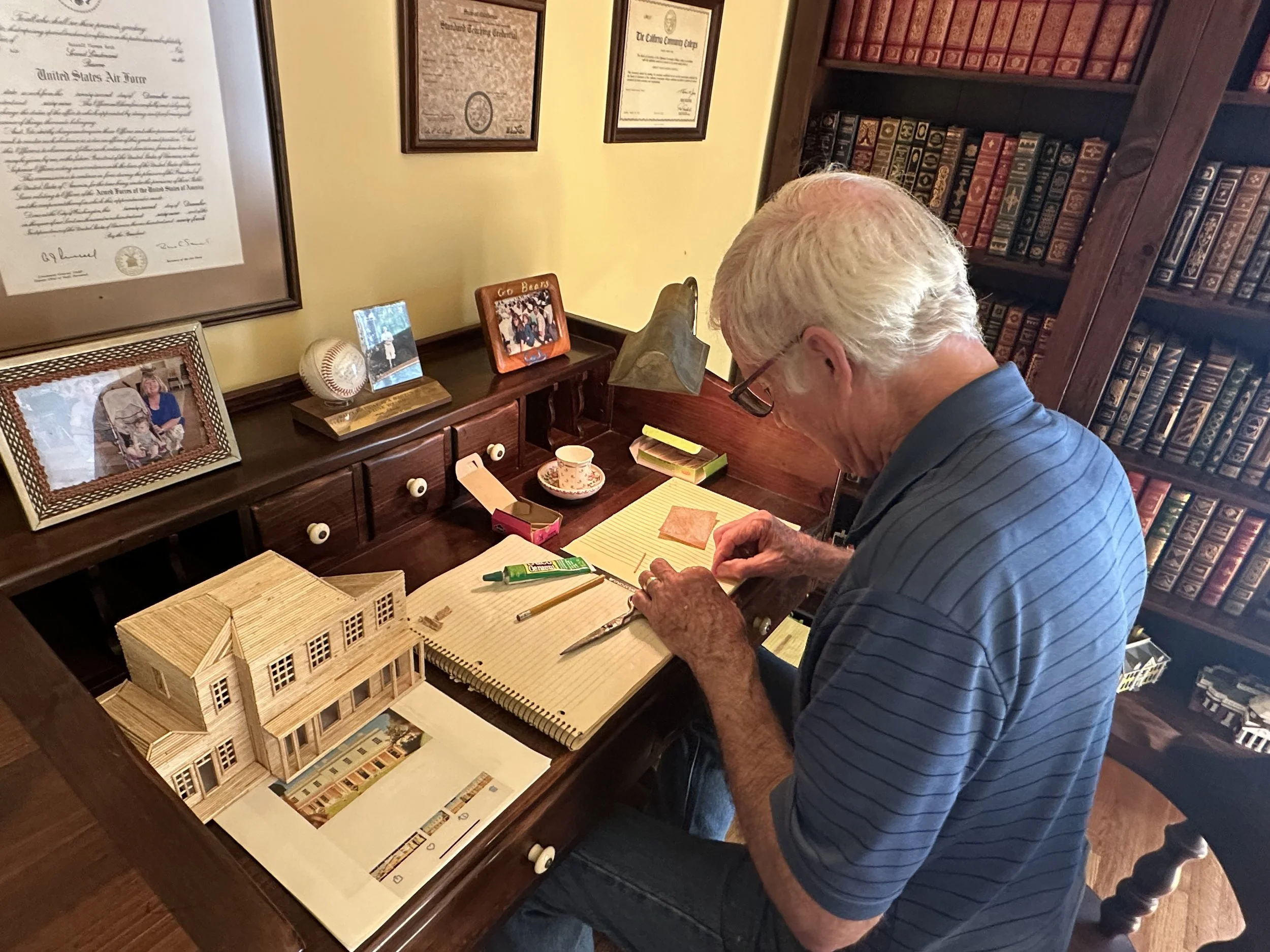 Enjoying both the challenge of the process and his satisfaction at the outcome, he moved on to different projects to see if he could do them, including a miniature bicycle, a wishing well, a stagecoach, and a baby grand piano (another gift for my mom, who is a talented pianist). Over time, his primary interest, at least in the domain of his toothpick creations, turned to buildings: buildings he visited (e.g, Mission Dolores in San Francisco, California; George Washington’s house, Mt. Vernon, in Virginia), buildings that were personally meaningful to him (e.g., the house he lives in, his church), buildings that he found architecturally impressive (e.g., Thomas Jefferson’s Monticello), and buildings that were connected to people he admired (e.g., his current project is Greenway, the home of the author Agatha Christie). As he approaches his seventy-eighth birthday this September, he has been consistently working on making something out of toothpicks for almost sixty years. To date, he has completed over thirty toothpick creations.