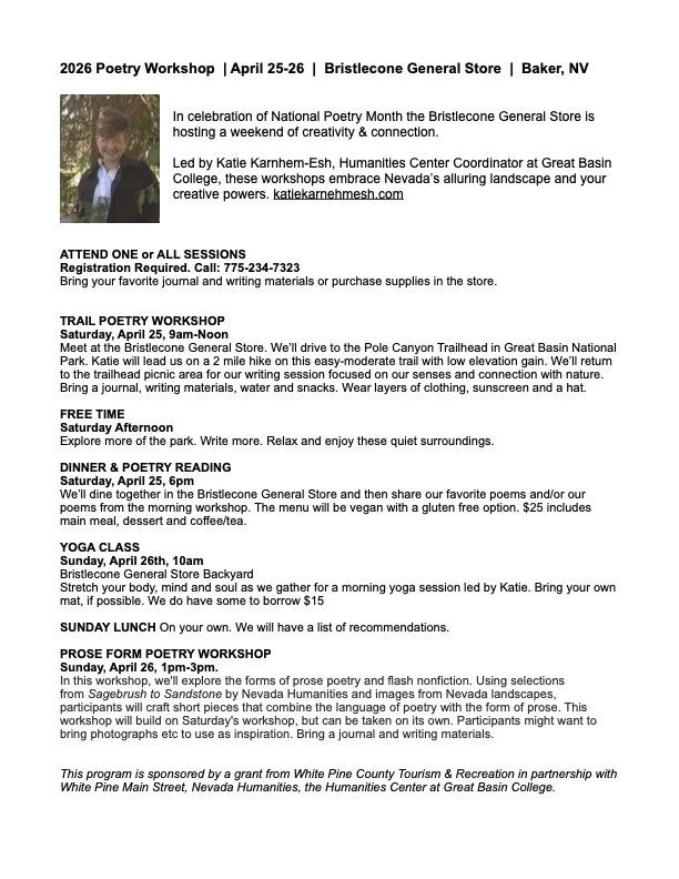 In celebration of National Poetry Month, join Nevada Humanities and the Bristlecone General Store in Baker for a weekend of creativity and connection! Led by Katie Karnehm-Esh, Humanities Center Coordinator at Great Basin College, these workshops embrace Nevada’s alluring landscape and your creative powers.