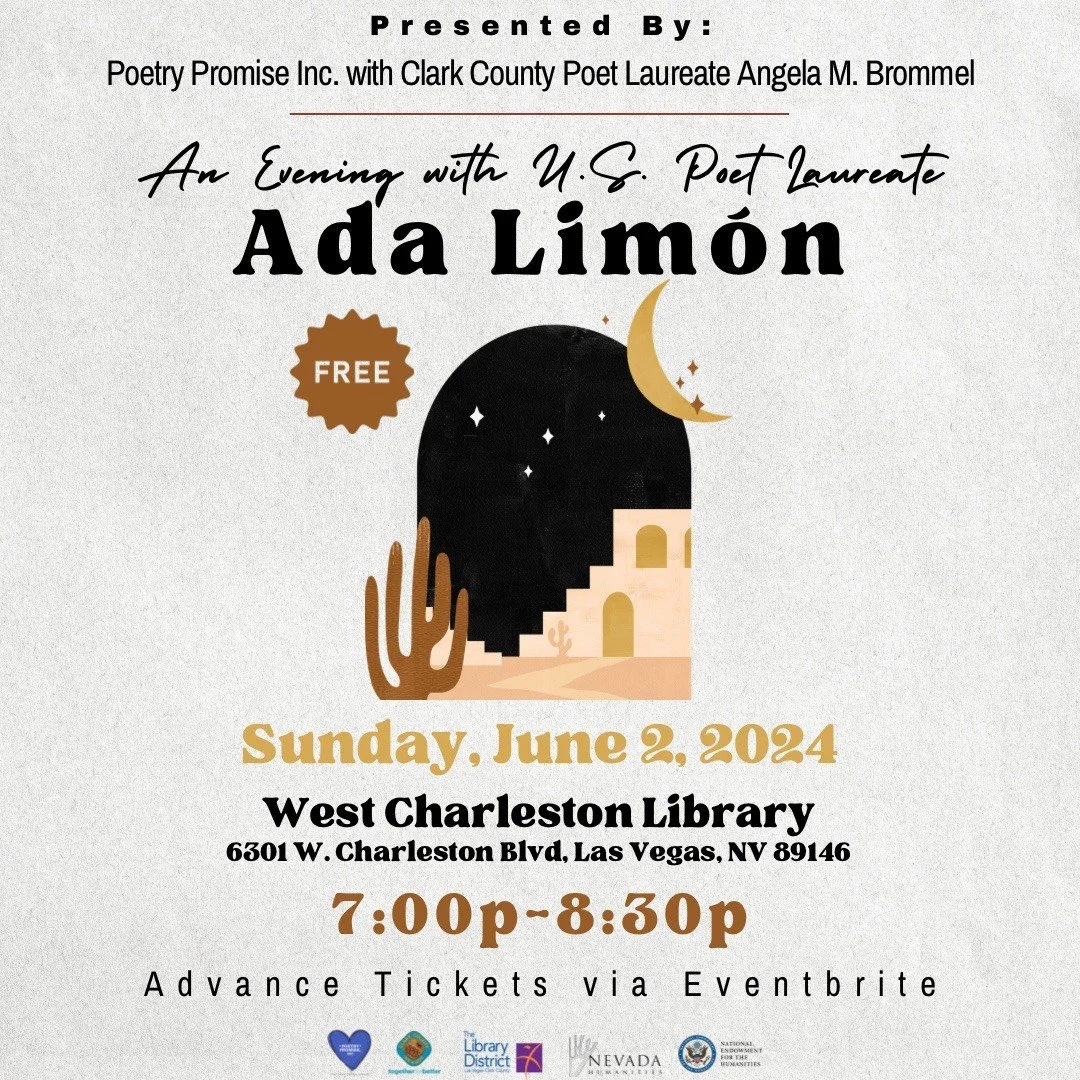 Poetry Promise, Inc., with Clark County Poet Laureate Angela M. Brommel, announce a special Poetry Promise Reading Series event featuring Ada Limόn, the 24th Poet Laureate of the United States. Admission is free and open to the public, and it is strongly recommended that you reserve seating in advance on Eventbrite. This program is produced by Poetry Promise, the Clark County Poet Laureate Program, the Las Vegas-Clark County Library District, Nevada Humanities, and the Nevada Center for the Book, with support from the National Endowment for the Humanities.