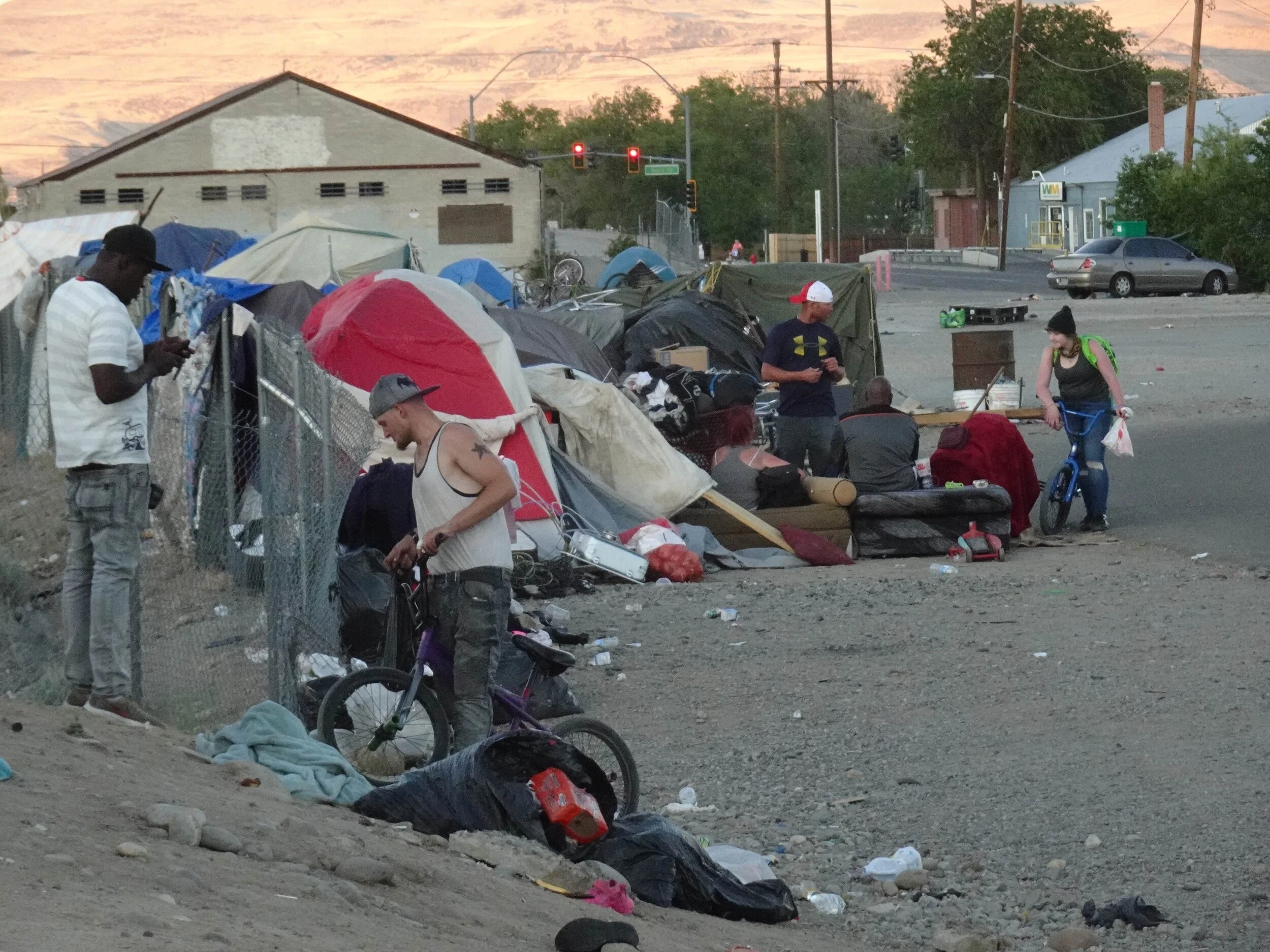 An encampment along railroad tracks in downtown Reno the night before it was disbanded earlier this summer, during the ongoing pandemic.