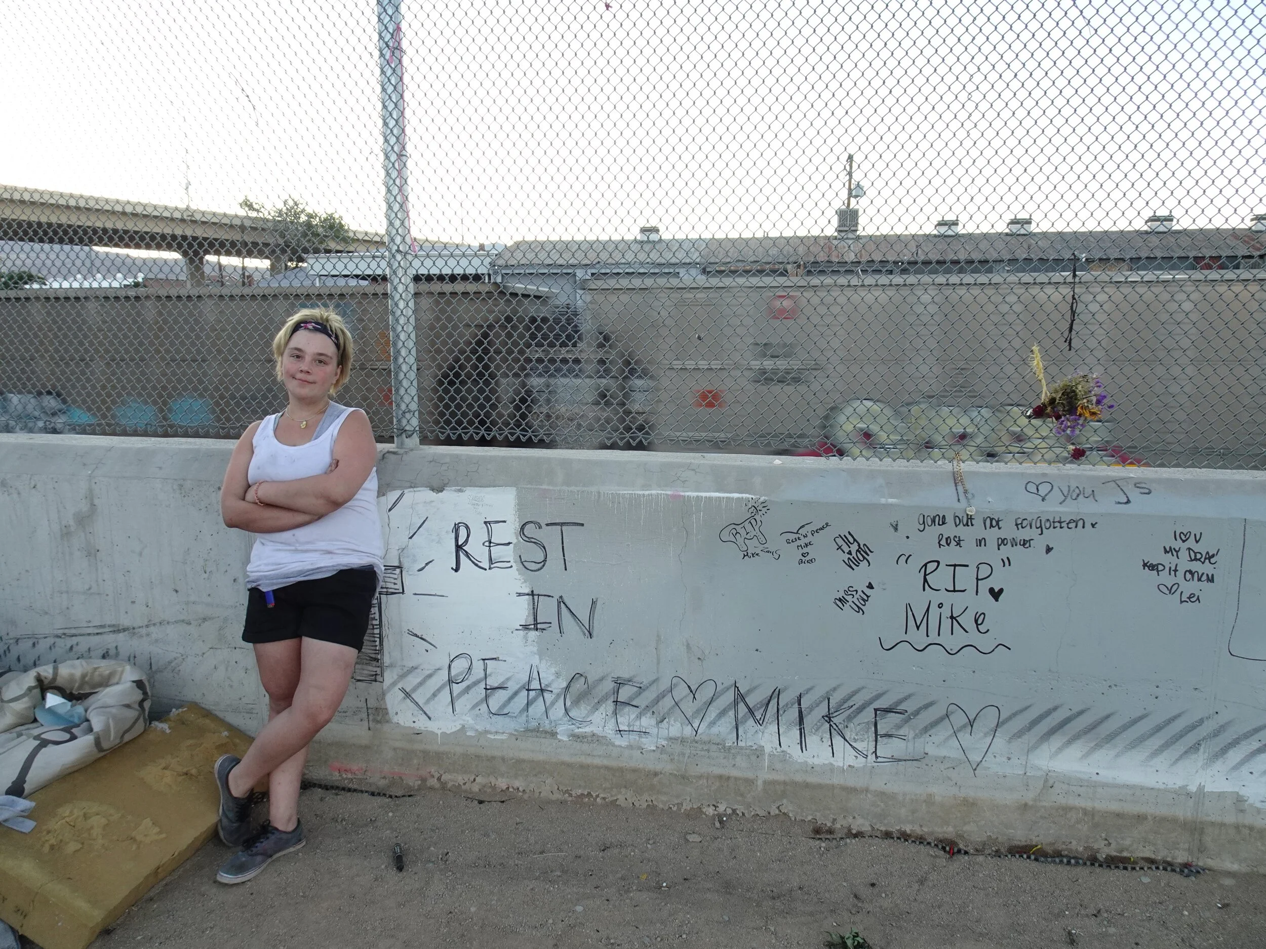 Moriah Stovall stands next to graffiti memorializing a man who was recently killed at an encampment near Reno's downtown baseball stadium.