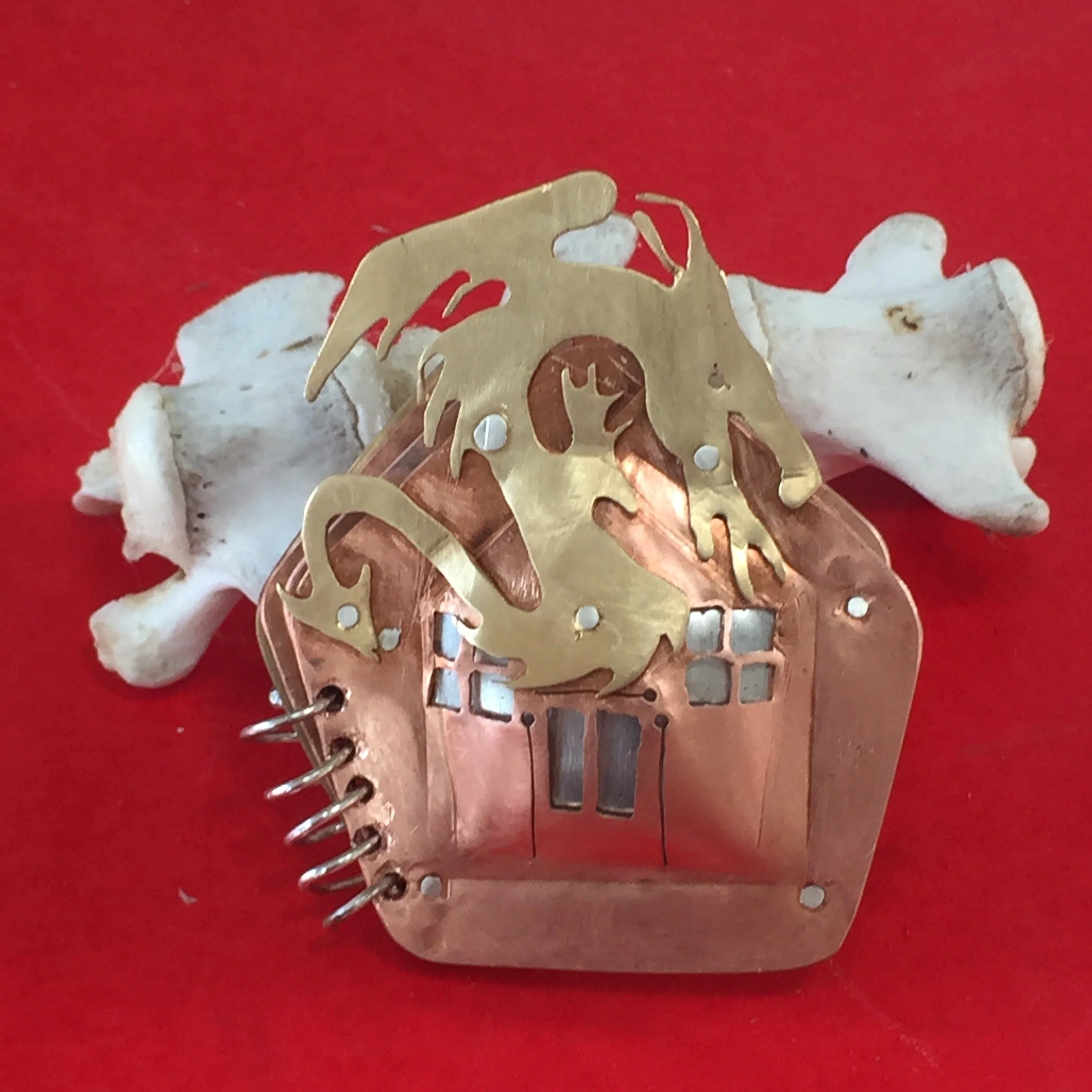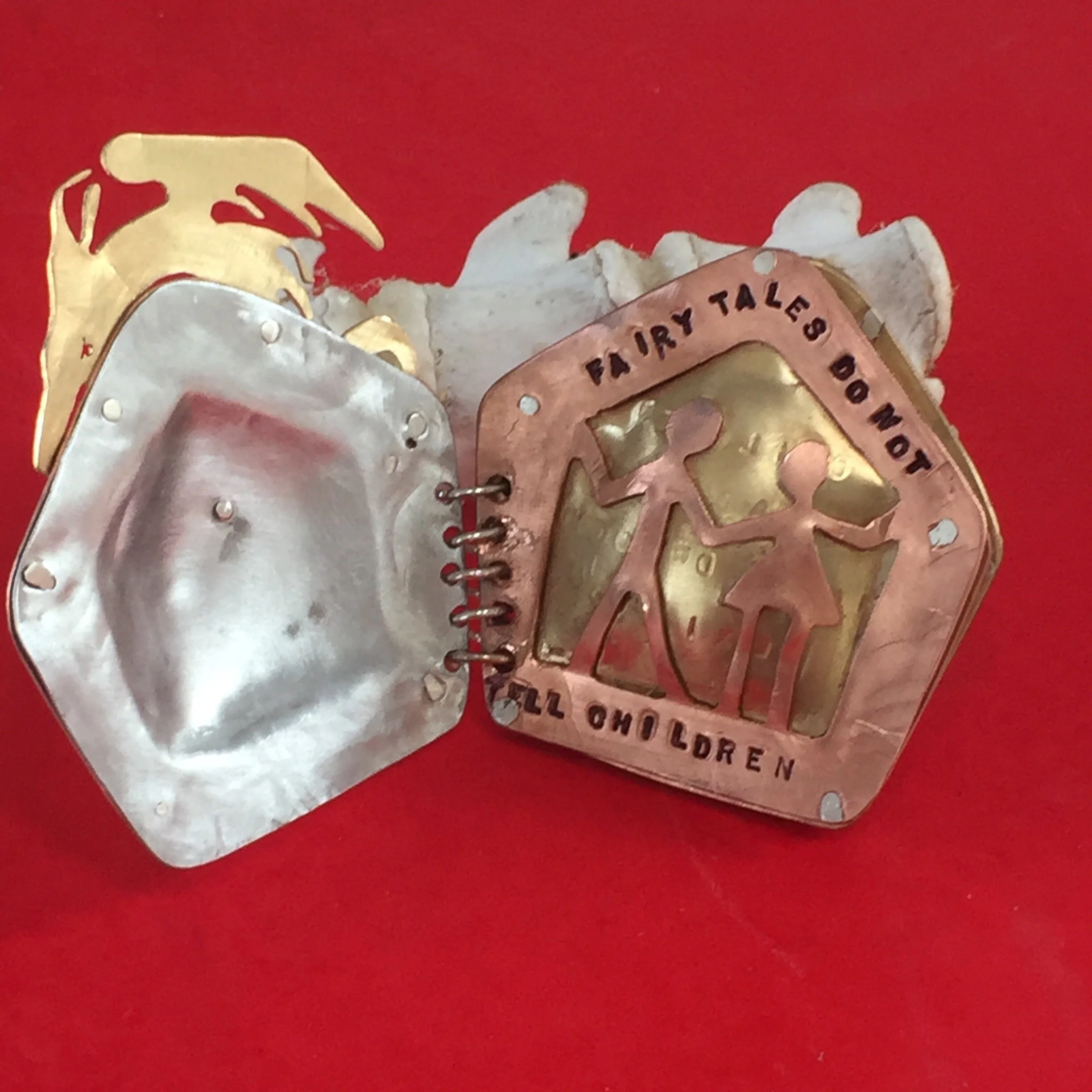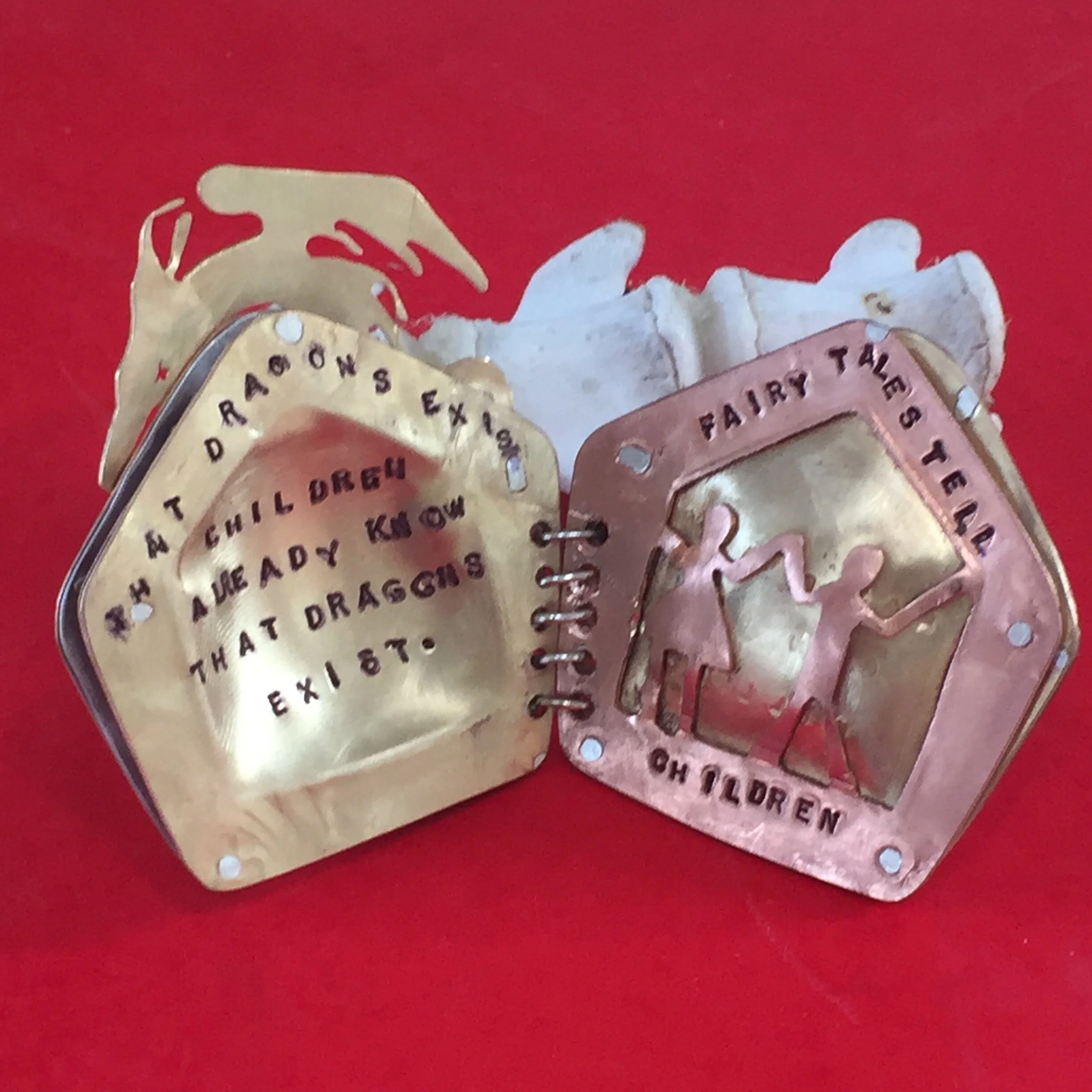 After much hunting I found a quote from G.K. Chesterton I thought pertinent. Using items from the packet Gail sent me I made a 2 ½”x 2 ½” book out of copper, brass, aluminum, and silver that in my eyes illustrated her concept. The quote is: “Fairy tales do not tell children that dragons exist. Children already know that dragons exist. Fairy tales tell children that dragons can be killed.” Fairy tales are not just stories, they are stories that teach. I was thinking of the COVID-19 virus as a dragon. The title of my book is Fairy Tales.