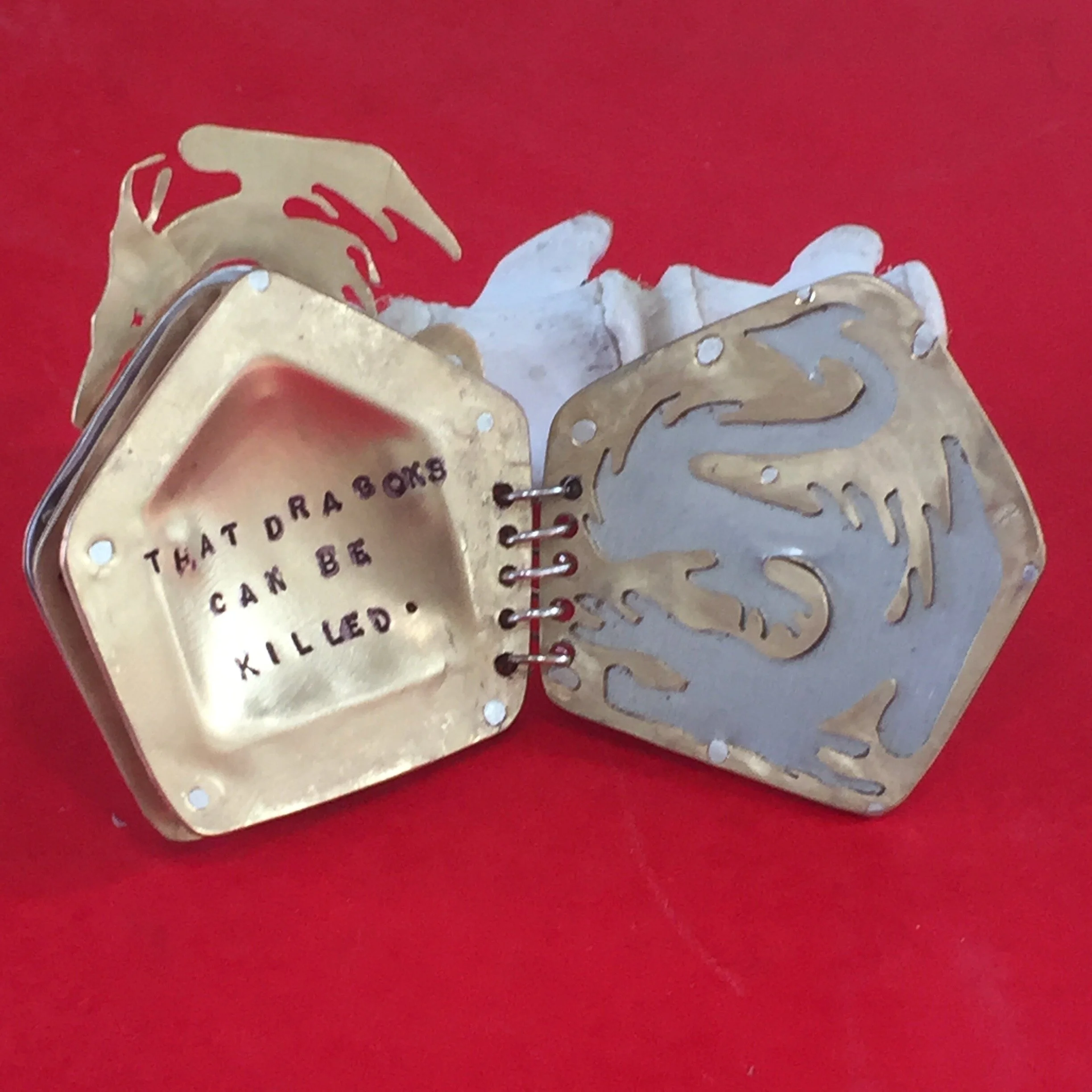 The whole process of fabricating out of metals is pretty foreign to me. I mean, you have to know exactly what you want to end up with before you even start. And you need to know a lot to be able to change course when you blow it. I was pretty sure I’d be able to make a book. But it took a lot of thinking, re-thinking, drawing, and research to finally get it right. My end product is not at all what I started out to make.